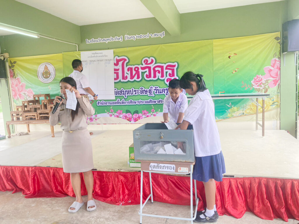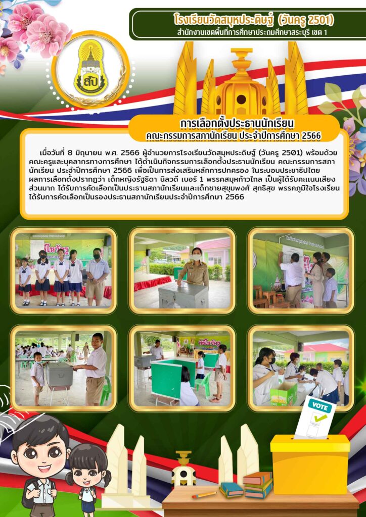 เมื่อวันที่ 8 มิถุนายน พ.ศ. 2566 ผู้อำนวยการโรงเรียนวัดสมุหประดิษฐ์ (วันครู 2501) พร้อมด้วยคณะครูและบุคลากรทางการศึกษา ได้ดำเนินกิจกรรมการเลือกตั้งประธานนักเรียน คณะกรรมการสภานักเรียน ประจำปีการศึกษา 2566 เพื่อเป็นการส่งเสริมหลักการปกครอง ในระบอบประชาธิปไตยผลการเลือกตั้งปรากฏว่า เด็กหญิงรัฐธิดา นิลวดี เบอร์ 1 พรรคสมุหก้าวไกล เป็นผู้ได้รับคะเเนนเสียงส่วนมาก ได้รับการคัดเลือกเป็นประธานสภานักเรียนเเละเด็กชายสุขุมพงศ์ สุทธิสุข พรรคภูมิใจโรงเรียนได้รับการคัดเลือกเป็นรองประธานสภานักเรียนประจำปีการศึกษา 2566