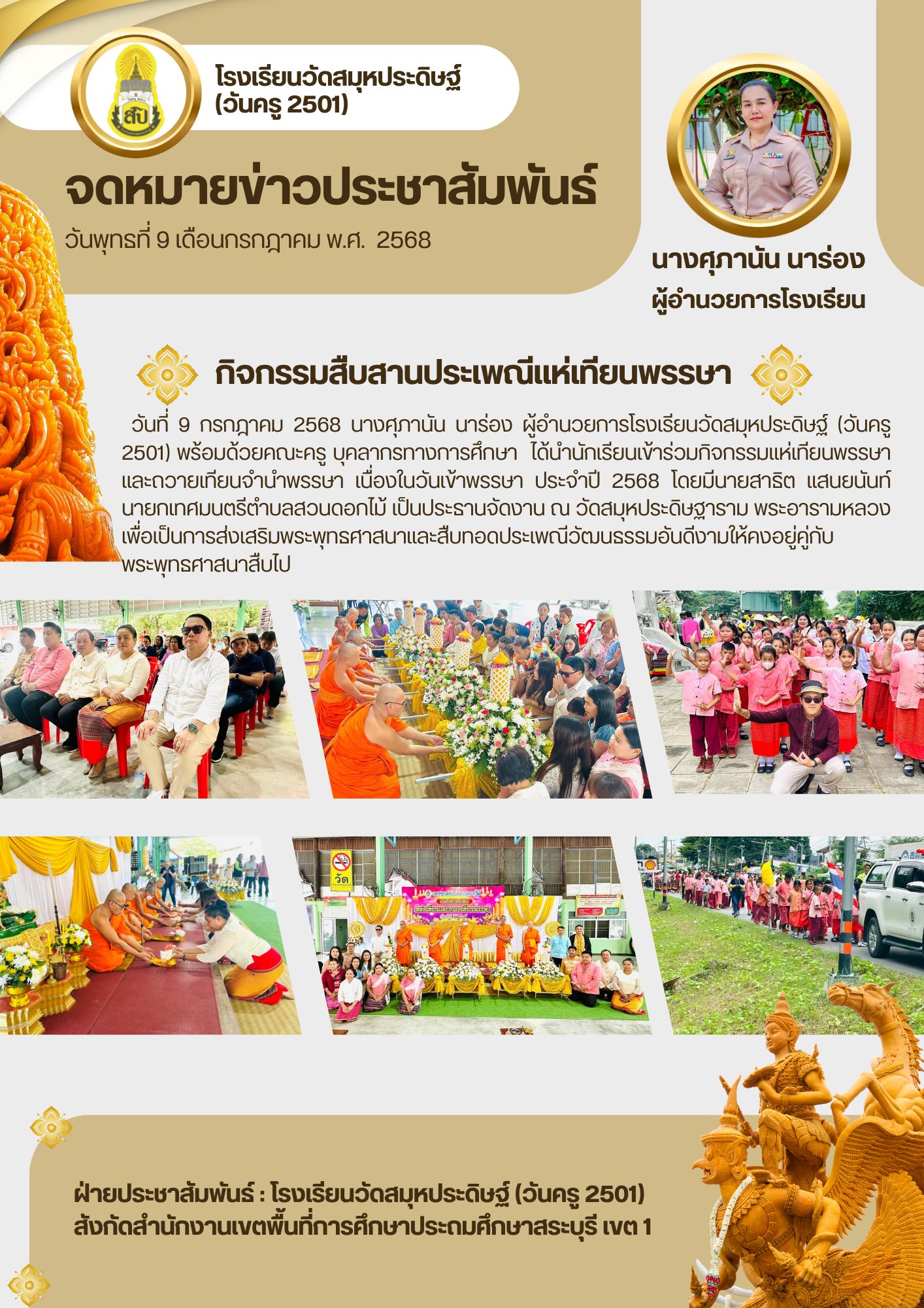 นางศุภานัน นาร่อง ผู้อำนวยการโรงเรียนวัดสมุหประดิษฐ์ (วันครู 2501) พร้อมด้วยคณะครู บุคลากรทางการศึกษา ได้นำนักเรียนเข้าร่วมกิจกรรมแห่เทียนพรรษาและถวายเทียนจำนำพรรษา เนื่องในวันเข้าพรรษา ประจำปี 2568 โดยมีนายสาธิต แสนยนันท์ นายกเทศมนตรีตำบลสวนดอกไม้ เป็นประธานจัดงาน ณ วัดสมุหประดิษฐาราม พระอารามหลวง เพื่อเป็นการส่งเสริมพระพุทธศาสนาและสืบทอดประเพณีวัฒนธรรมอันดีงามให้คงอยู่คู่กับพระพุทธศาสนาสืบไป![]()