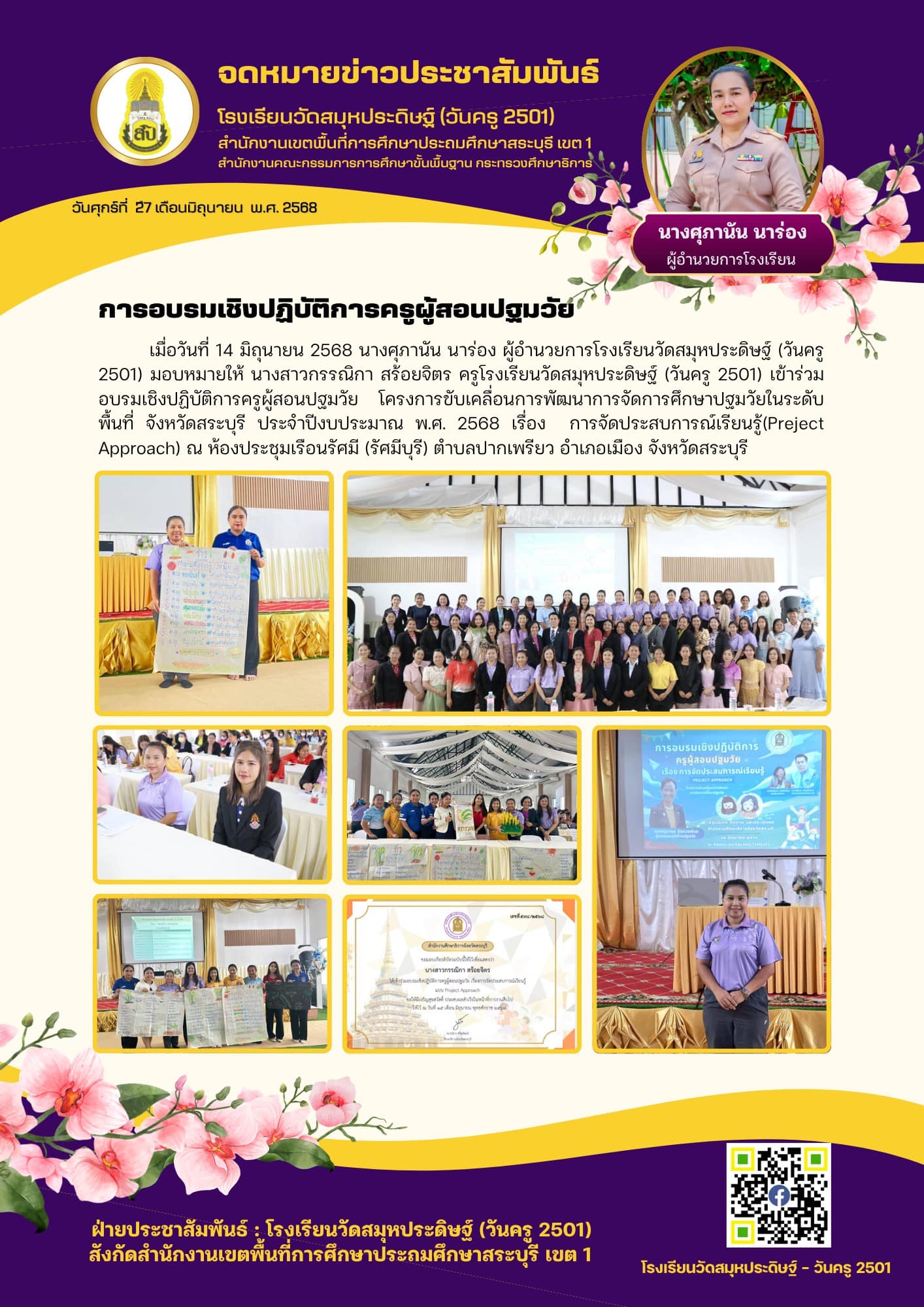 นางศุภานัน นาร่อง ผู้อำนวยการโรงเรียนวัดสมุหประดิษฐ์ (วันครู 2501) มอบหมายให้ นางสาวกรรณิกา สร้อยจิตร ครูโรงเรียนวัดสมุหประดิษฐ์ (วันครู 2501) เข้าร่วมอบรมเชิงปฏิบัติการครูผู้สอนปฐมวัย โครงการขับเคลื่อนการพัฒนาการจัดการศึกษาปฐมวัยในระดับพื้นที่ จังหวัดสระบุรี ประจำปีงบประมาณ พ.ศ. 2568 เรื่อง การจัดประสบการณ์เรียนรู้(Preject Approach) ณ ห้องประชุมเรือนรัศมี (รัศมีบุรี) ตำบลปากเพรียว อำเภอเมือง จังหวัดสระบุรี![]()