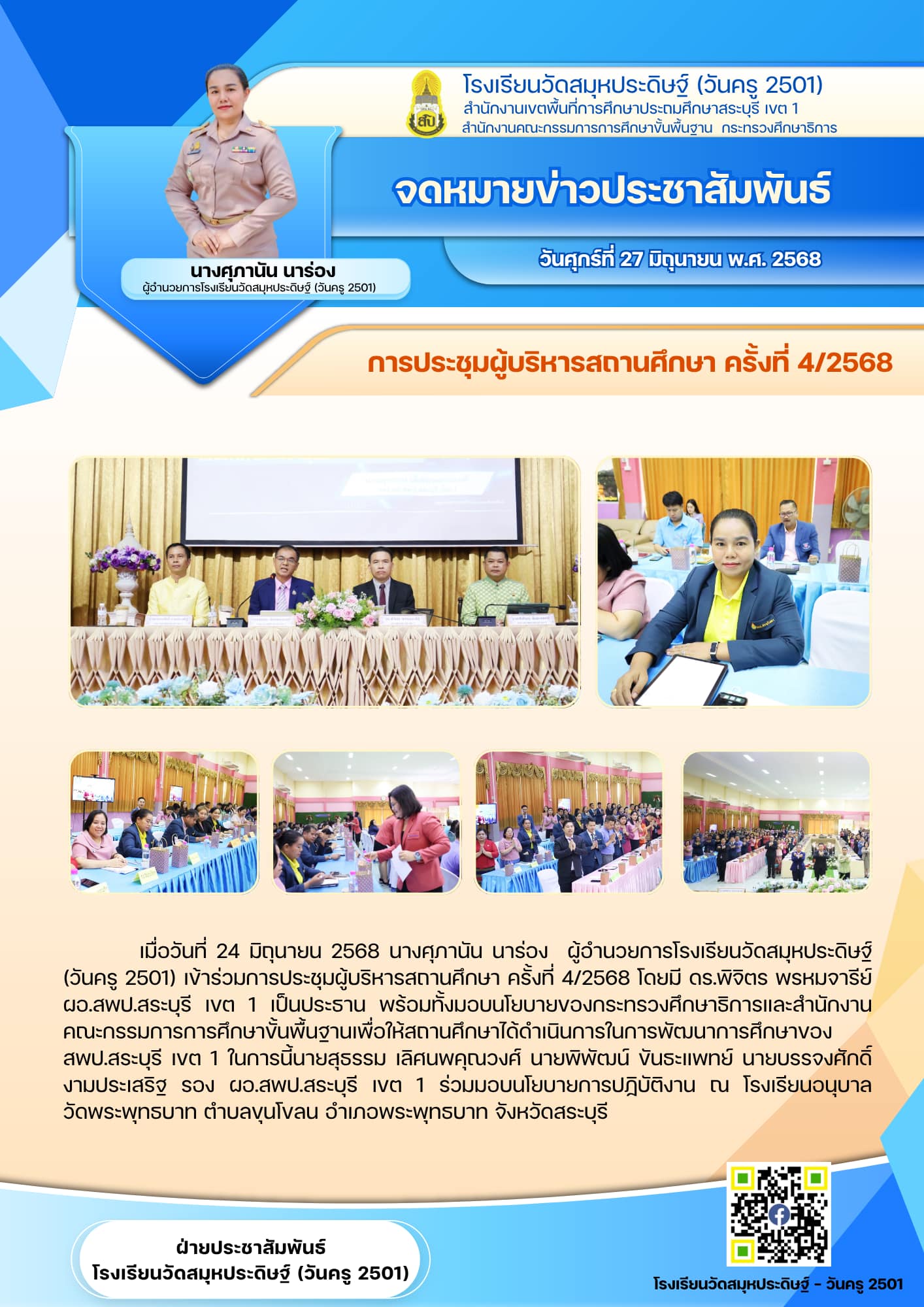 นางศุภานัน นาร่อง ผู้อำนวยการโรงเรียนวัดสมุหประดิษฐ์ (วันครู 2501) เข้าร่วมการประชุมผู้บริหารสถานศึกษา ครั้งที่ 4/2568 โดยมี ดร.พิจิตร พรหมจารีย์ ผอ.สพป.สระบุรี เขต 1 เป็นประธาน พร้อมทั้งมอบนโยบายของกระทรวงศึกษาธิการและสำนักงานคณะกรรมการการศึกษาขั้นพื้นฐานเพื่อให้สถานศึกษาได้ดำเนินการในการพัฒนาการศึกษาของสพป.สระบุรี เขต 1 ในการนี้นายสุธรรม เลิศนพคุณวงศ์ นายพิพัฒน์ ขันธะแพทย์ นายบรรจงศักดิ์ งามประเสริฐ รอง ผอ.สพป.สระบุรี เขต 1 ร่วมมอบนโยบายการปฏิบัติงาน ณ โรงเรียนอนุบาล วัดพระพุทธบาท ตำบลขุนโขลน อำเภอพระพุทธบาท จังหวัดสระบุรี 📝