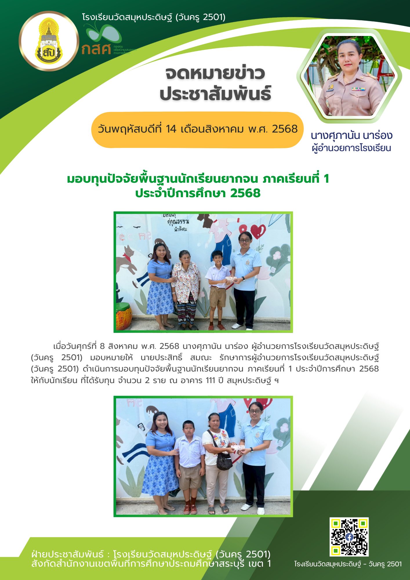 นางศุภานัน นาร่อง ผู้อำนวยการโรงเรียนวัดสมุหประดิษฐ์ (วันครู 2501) มอบหมายให้ นายประสิทธิ์ สมณะ รักษาการผู้อำนวยการโรงเรียนวัดสมุหประดิษฐ์ (วันครู 2501) ดำเนินการมอบทุนปัจจัยพื้นฐานนักเรียนยากจน ภาคเรียนที่ 1 ประจำปีการศึกษา 2568 ให้กับนักเรียนที่ได้รับทุน จำนวน 2 ราย ณ อาคาร 111 ปี สมุหประดิษฐ์ ฯ ![]()