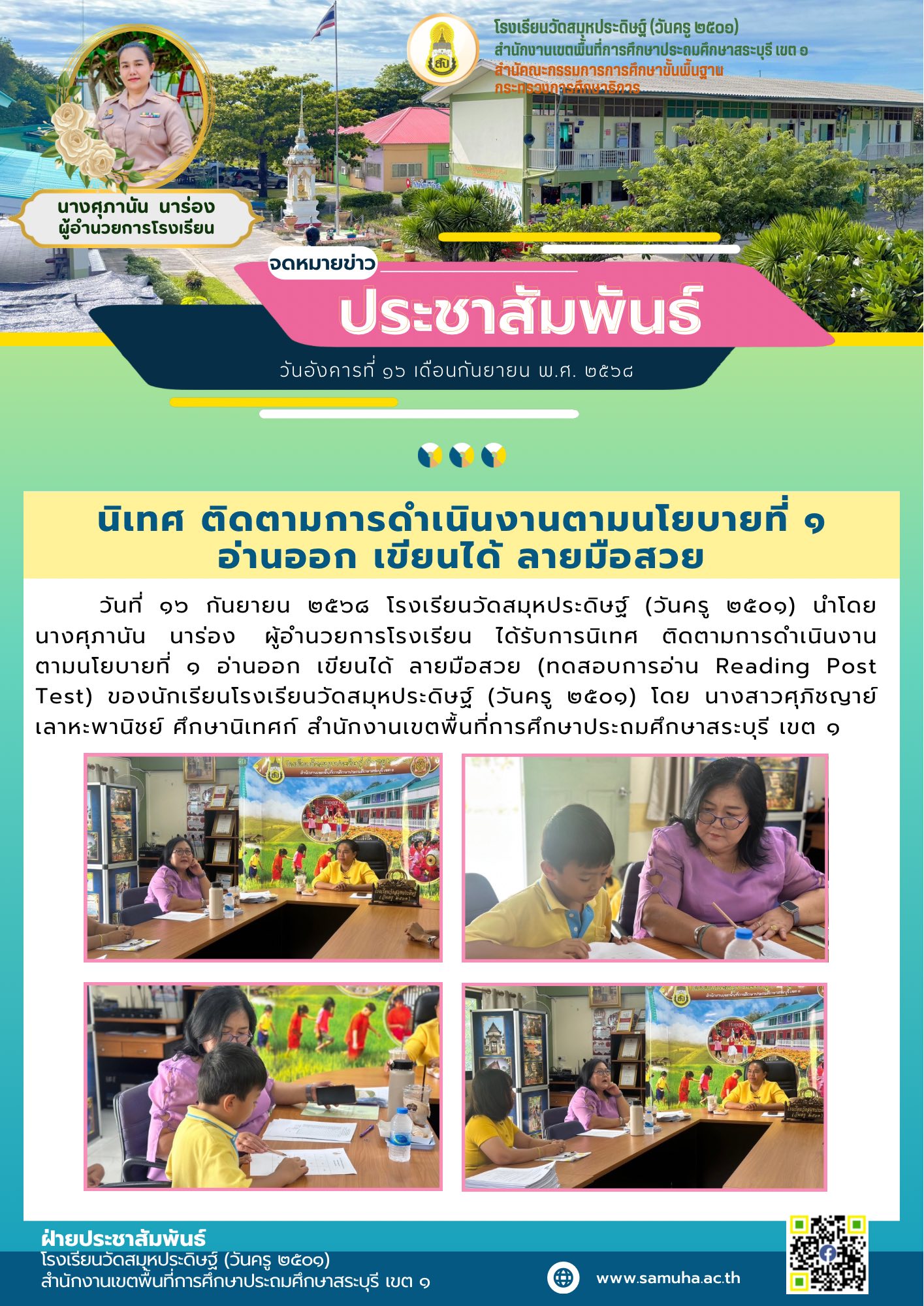 โรงเรียนวัดสมุหประดิษฐ์ (วันครู ๒๕๐๑) นำโดย นางศุภานัน นาร่อง ผู้อำนวยการโรงเรียน ได้รับการนิเทศ ติดตามการดำเนินงานตามนโยบายที่ ๑ อ่านออก เขียนได้ ลายมือสวย (ทดสอบการอ่าน Reading Post Test) ของนักเรียนโรงเรียนวัดสมุหประดิษฐ์ (วันครู ๒๕๐๑) โดย นางสาวศุภิชญาย์ เลาหะพานิชย์ ศึกษานิเทศก์ สำนักงานเขตพื้นที่การศึกษาประถมศึกษาสระบุรี เขต ๑![]()