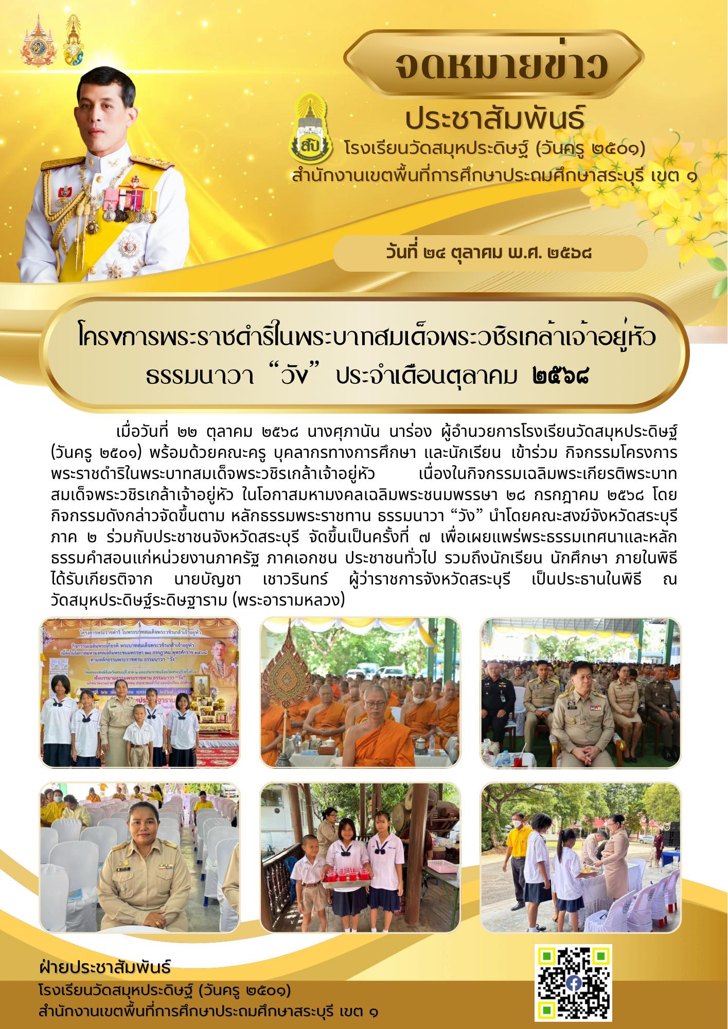นางศุภานัน นาร่อง ผู้อำนวยการโรงเรียนวัดสมุหประดิษฐ์ (วันครู ๒๕๐๑) พร้อมด้วยคณะครู บุคลากรทางการศึกษา และนักเรียน เข้าร่วม กิจกรรมโครงการพระราชดำริในพระบาทสมเด็จพระวชิรเกล้าเจ้าอยู่หัว เนื่องในกิจกรรมเฉลิมพระเกียรติพระบาทสมเด็จพระวชิรเกล้าเจ้าอยู่หัว ในโอกาสมหามงคลเฉลิมพระชนมพรรษา ๒๘ กรกฎาคม ๒๕๖๘ โดยกิจกรรมดังกล่าวจัดขึ้นตาม หลักธรรมพระราชทาน ธรรมนาวา “วัง” นำโดยคณะสงฆ์จังหวัดสระบุรี ภาค ๒ ร่วมกับประชาชนจังหวัดสระบุรี จัดขึ้นเป็นครั้งที่ ๗ เพื่อเผยแพร่พระธรรมเทศนาและหลักธรรมคำสอนแก่หน่วยงานภาครัฐ ภาคเอกชน ประชาชนทั่วไป รวมถึงนักเรียน นักศึกษา ภายในพิธีได้รับเกียรติจาก นายบัญชา เชาวรินทร์ ผู้ว่าราชการจังหวัดสระบุรี เป็นประธานในพิธี ณ วัดสมุหประดิษฐ์ระดิษฐาราม (พระอารามหลวง)![]()