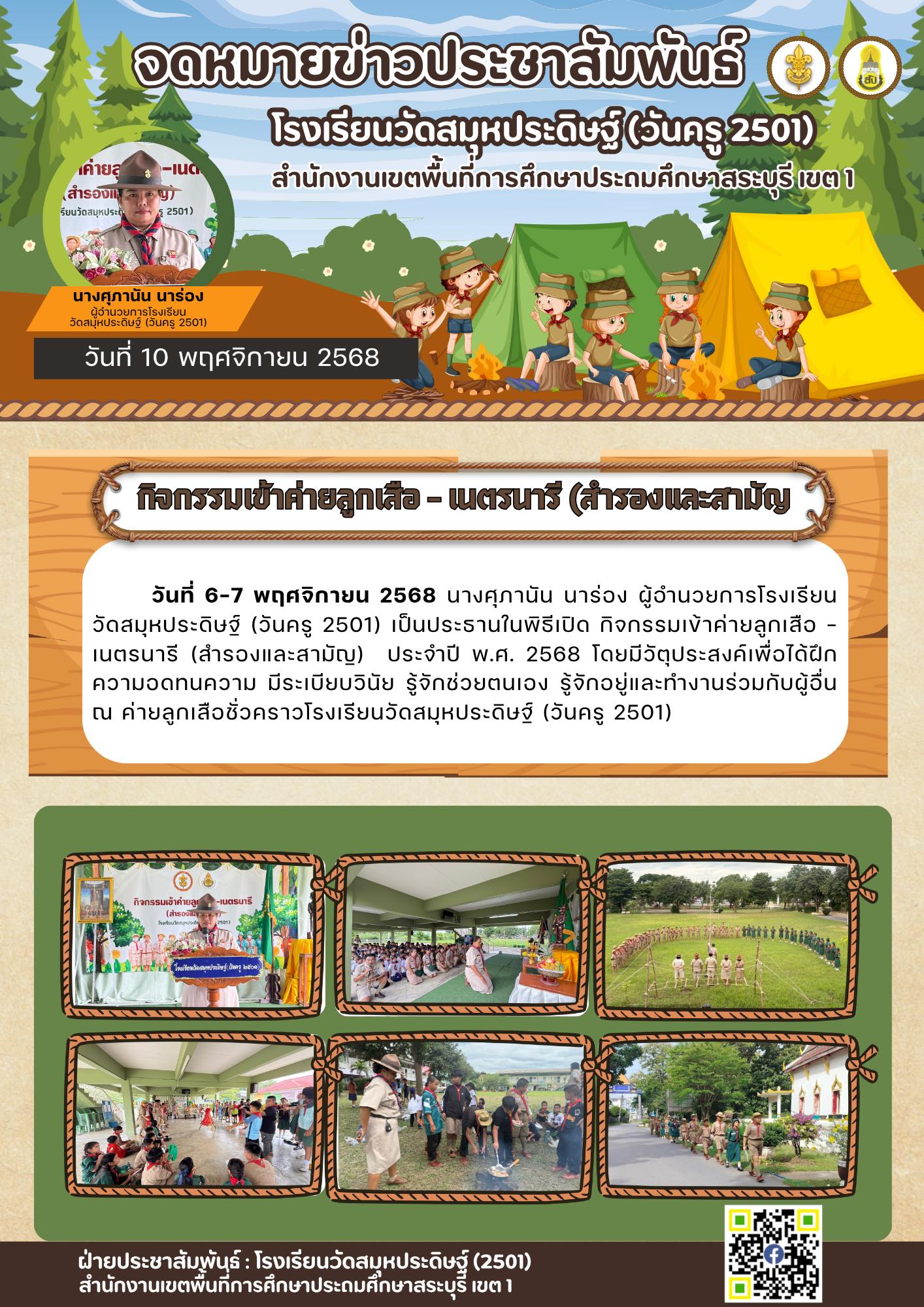 นางศุภานัน นาร่อง ผู้อำนวยการโรงเรียนวัดสมุหประดิษฐ์ (วันครู 2501) เป็นประธานในพิธีเปิด กิจกรรมเข้าค่ายลูกเสือ – เนตรนารี (สำรองและสามัญ) ประจำปี พ.ศ. 2568 โดยมีวัตุประสงค์เพื่อได้ฝึกความอดทนความ มีระเบียบวินัย รู้จักช่วยตนเอง รู้จักอยู่และทำงานร่วมกับผู้อื่น ณ ค่ายลูกเสือชั่วคราวโรงเรียนวัดสมุหประดิษฐ์ (วันครู 2501) ![]()
