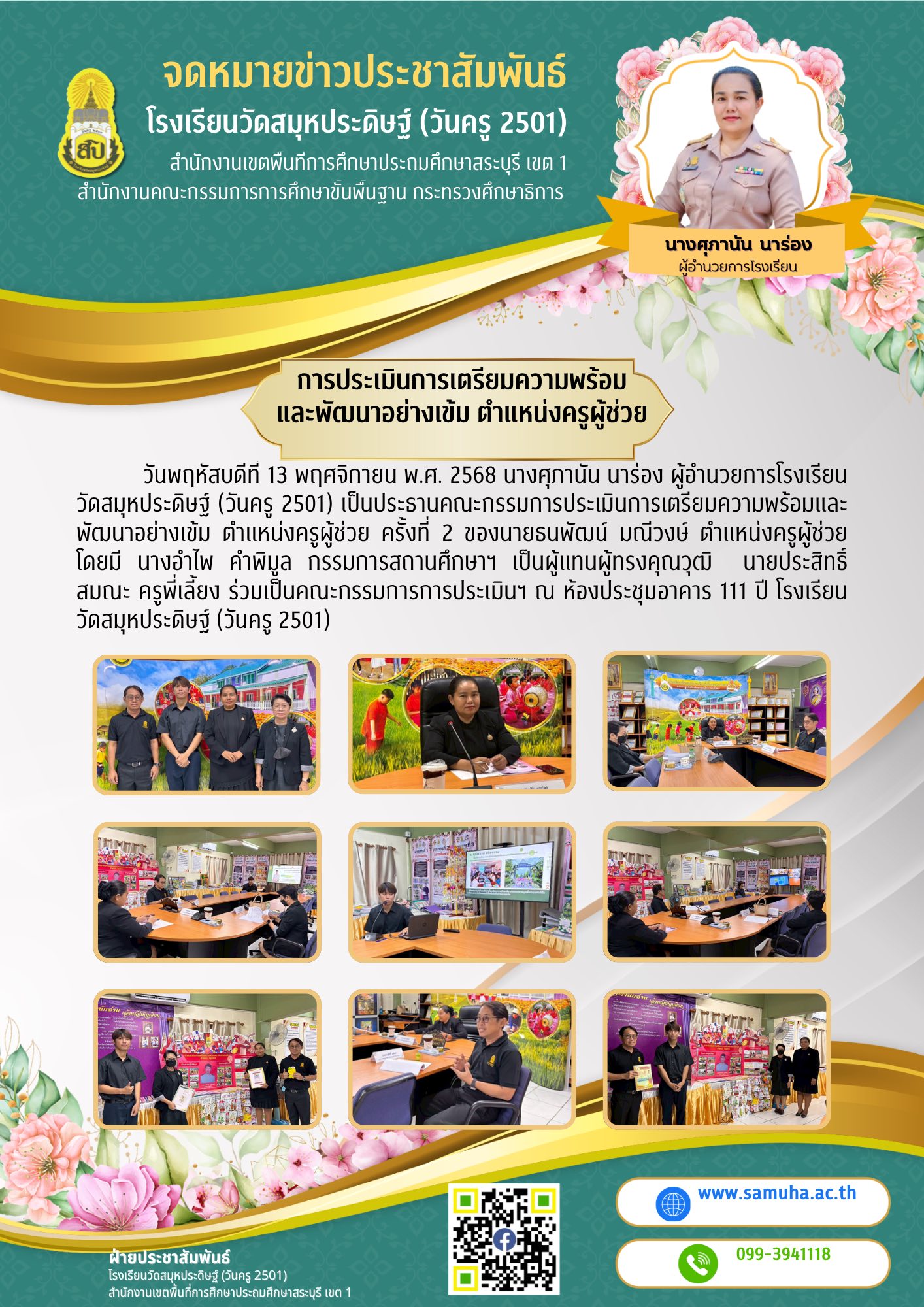 นางศุภานัน นาร่อง ผู้อำนวยการโรงเรียนวัดสมุหประดิษฐ์ (วันครู 2501) เป็นประธานคณะกรรมการประเมินการเตรียมความพร้อมและพัฒนาอย่างเข้ม ตำแหน่งครูผู้ช่วย ครั้งที่ 2 ของนายธนพัฒน์ มณีวงษ์ ตำเเหน่งครูผู้ช่วย โดยมี นางอำไพ คำพิมูล กรรมการสถานศึกษาฯ เป็นผู้แทนผู้ทรงคุณวุฒิ นายประสิทธิ์ สมณะ ครูพี่เลี้ยง ร่วมเป็นคณะกรรมการการประเมินฯ ณ ห้องประชุมอาคาร 111 ปี โรงเรียนวัดสมุหประดิษฐ์ (วันครู 2501)![]()