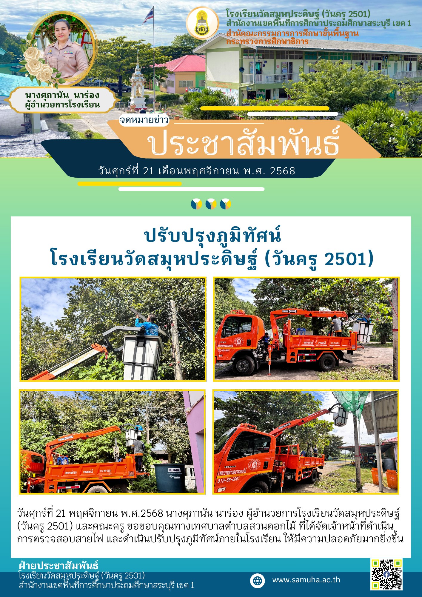 นางศุภานัน นาร่อง ผู้อำนวยการโรงเรียนวัดสมุหประดิษฐ์ (วันครู 2501) และคณะครู ขอขอบคุณทางเทศบาลตำบลสวนดอกไม้ ที่ได้จัดเจ้าหน้าที่ดำเนินการตรวจสอบสายไฟ และดำเนินปรับปรุงภูมิทัศน์ภายในโรงเรียน ให้มีความปลอดภัยมากยิ่งขึ้น