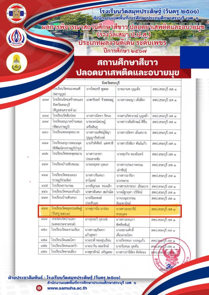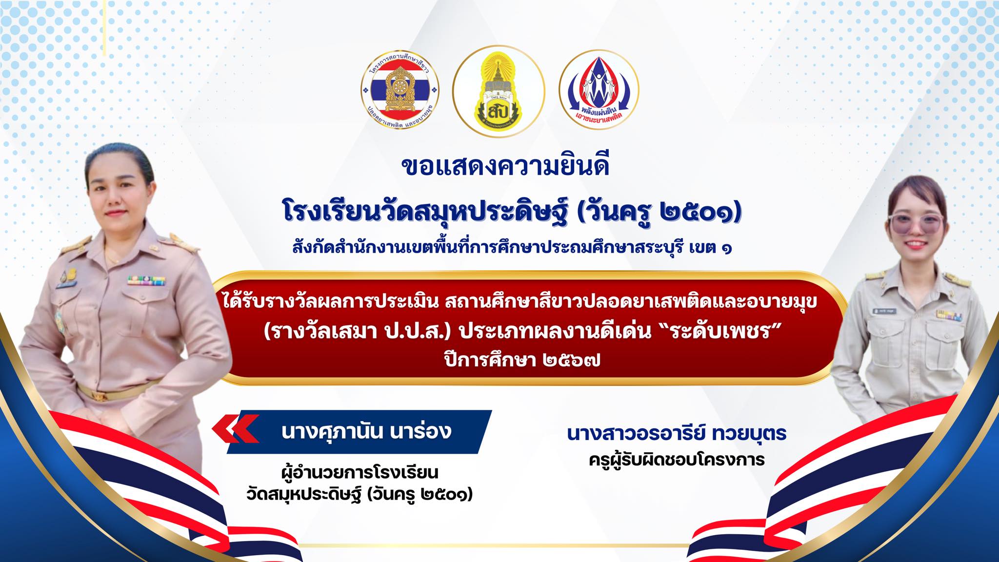 ✨โรงเรียนวัดสมุหประดิษฐ์ (วันครู 2501) นำโดยนางศุภานัน นาร่อง ผู้อำนวยการโรงเรียน พร้อมด้วยนางสาวอรอารีย์ ทวยบุตร ครูผู้รับผิดชอบและขับเคลื่อนโครงการ ได้รับรางวัล สถานศึกษาสีขาว ปลอดยาเสพติดและอบายมุข กระทรวงศึกษาธิการ ประเภทผลงานดีเด่น “ระดับเพชร” ประจำปีการศึกษา 2567💎🇹🇭