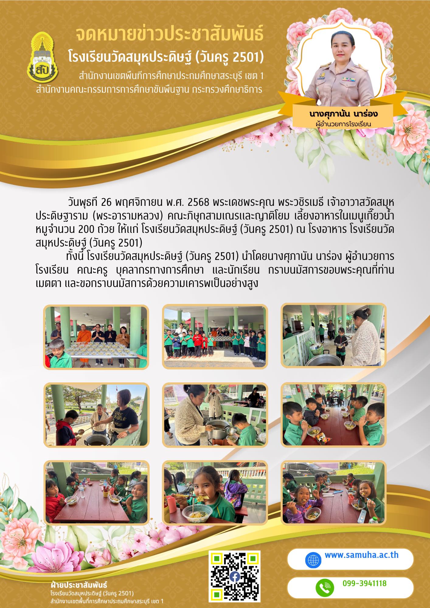 พระเดชพระคุณ พระวชิรเมธี เจ้าอาวาสวัดสมุหประดิษฐาราม (พระอารามหลวง) คณะภิษุกสามเณรเเละญาติโยม เลี้ยงอาหารในเมนูเกี๊ยวน้ำหมูจำนวน 200 ถ้วย ให้เเก่ โรงเรียนวัดสมุหประดิษฐ์ (วันครู 2501) ณ โรงอาหาร โรงเรียนวัดสมุหประดิษฐ์ (วันครู 2501)![]()