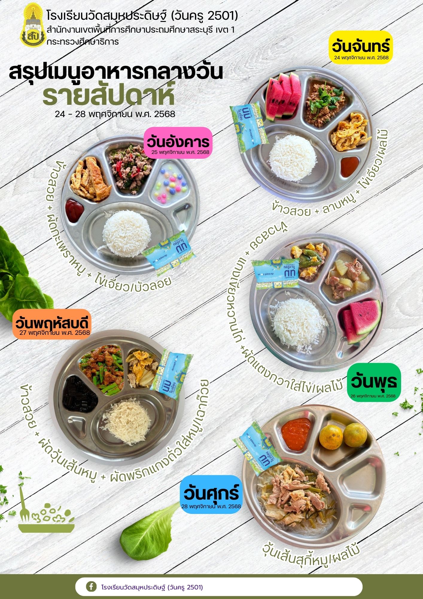 21 พฤศจิกายน พ.ศ. 2568 : ข้าวสวย + แกงเขียวหวานไก่ +ผัดแตงกวาใส่ไข่/ผลไม้/นมโรงเรียน
