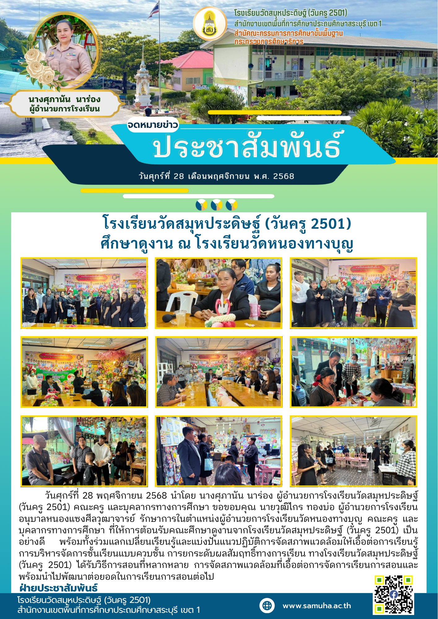 นำโดย นางศุภานัน นาร่อง ผู้อำนวยการโรงเรียนวัดสมุหประดิษฐ์ (วันครู 2501) คณะครู และบุคลากรทางการศึกษา ขอขอบคุณ นายวุฒิไกร ทองบ่อ ผู้อำนวยการโรงเรียนอนุบาลหนองแซงศีลวุฒาจารย์ รักษาการในตำแหน่งผู้อำนวยการโรงเรียนวัดหนองทางบุญ คณะครู และบุคลากรทางการศึกษา ที่ให้การต้อนรับคณะศึกษาดูงานจากโรงเรียนวัดสมุหประดิษฐ์ (วันครู 2501) เป็นอย่างดี พร้อมทั้งร่วมแลกเปลี่ยนเรียนรู้และแบ่งปันแนวปฏิบัติการจัดสภาพแวดล้อมให้เอื้อต่อการเรียนรู้การบริหารจัดการชั้นเรียนแบบควบชั้น การยกระดับผลสัมฤทธิ์ทางการเรียน ทางโรงเรียนวัดสมุหประดิษฐ์ (วันครู 2501) ได้รับวิธีการสอนที่หลากหลาย การจัดสภาพแวดล้อมที่เอื้อต่อการจัดการเรียนการสอนและพร้อมนำไปพัฒนาต่อยอดในการเรียนการสอนต่อไป![]()