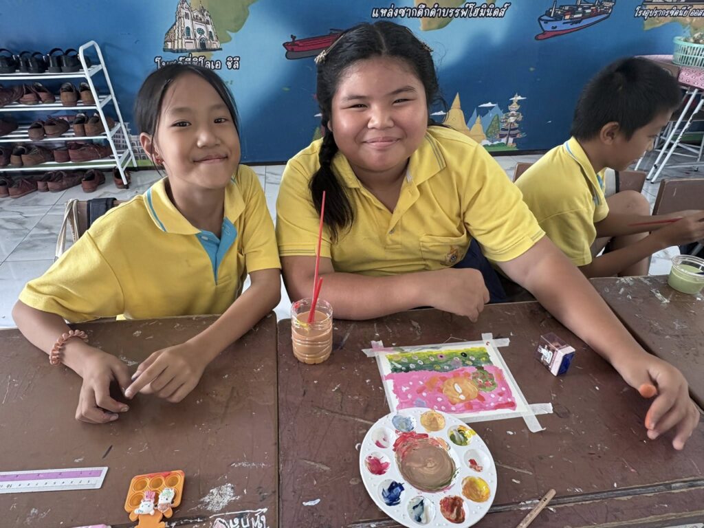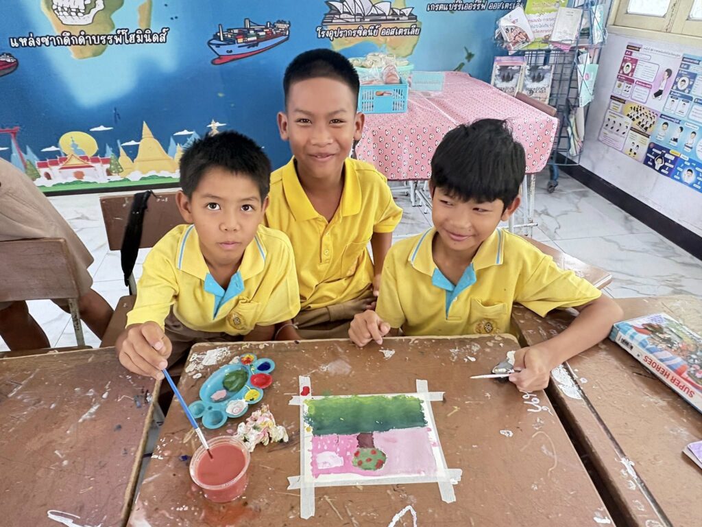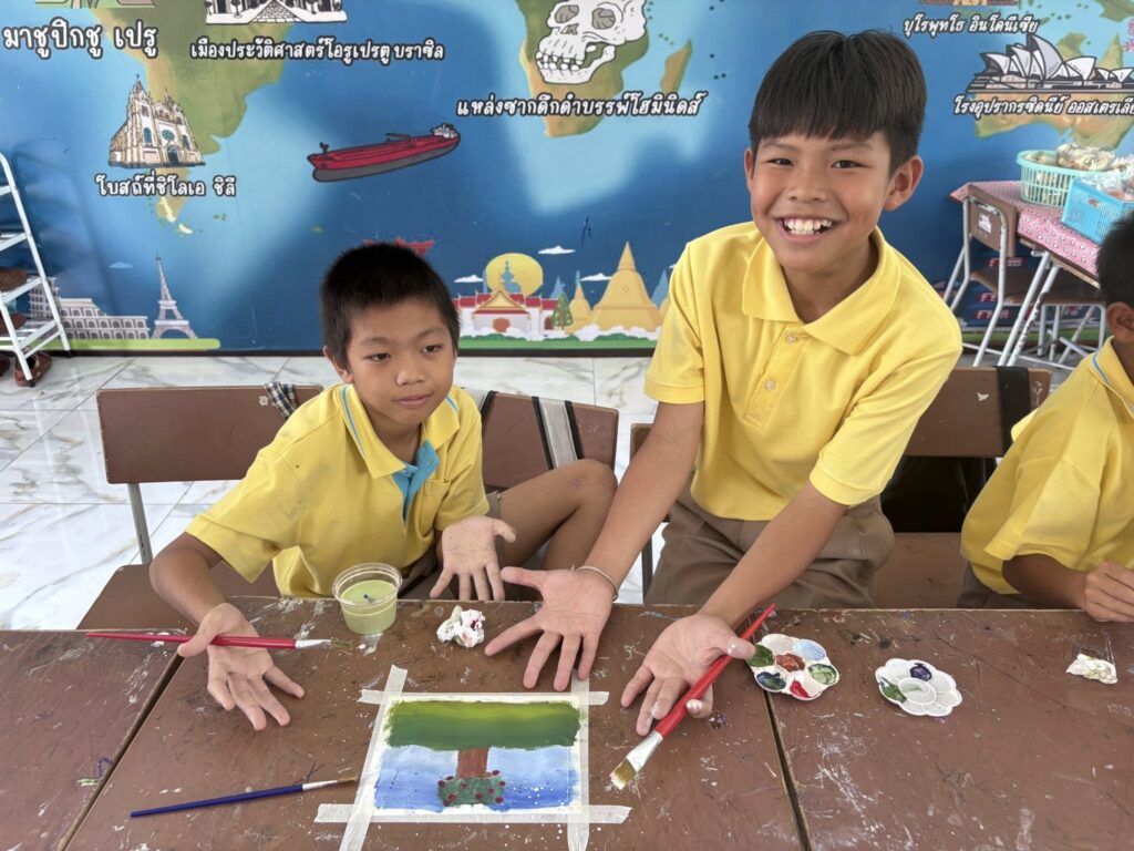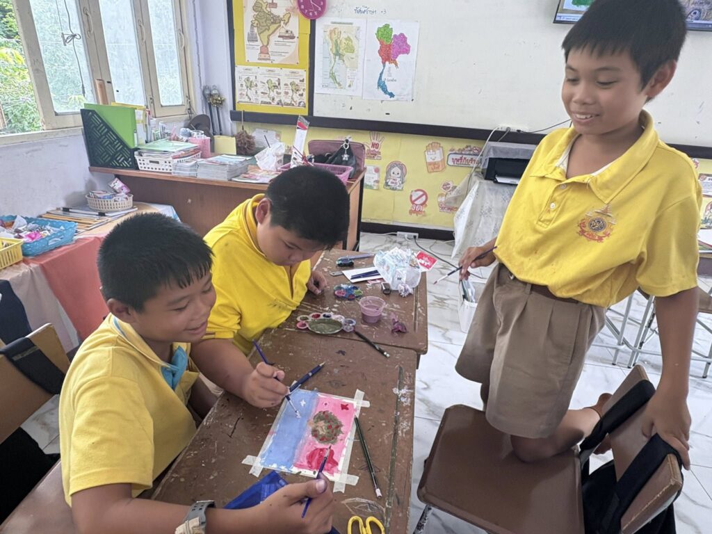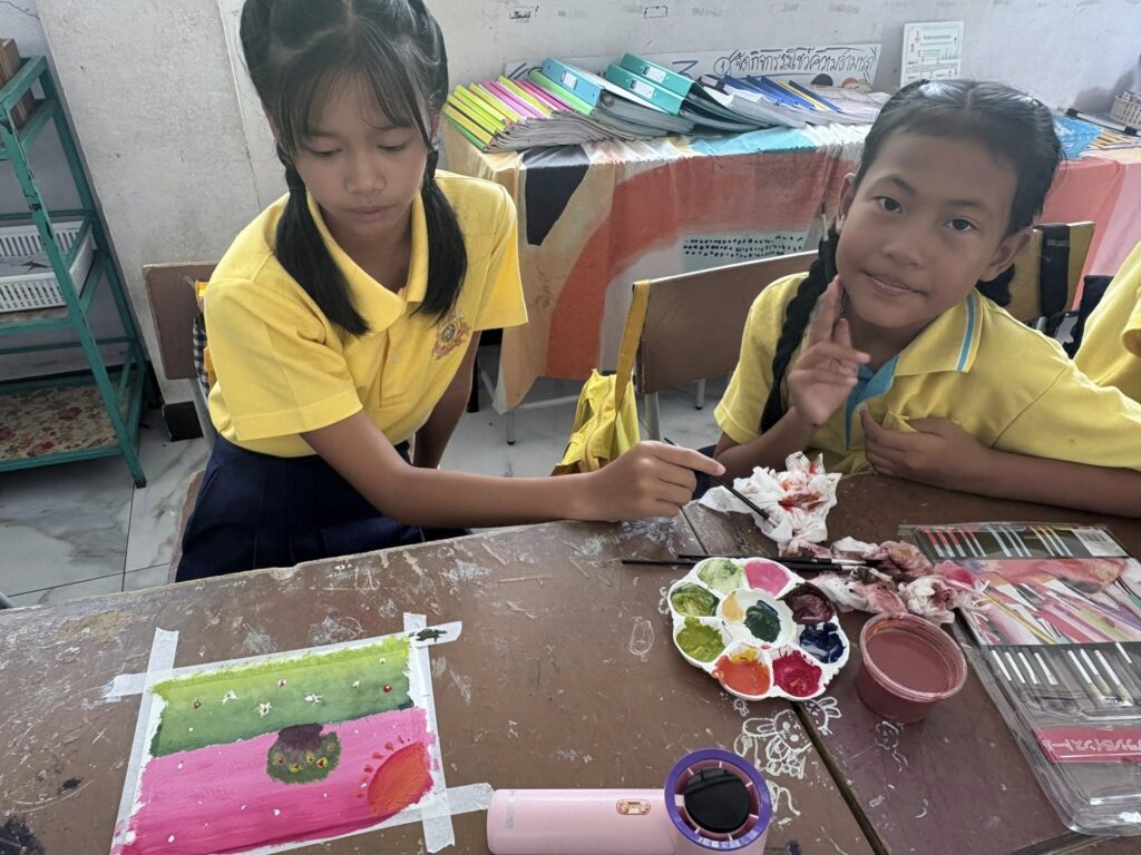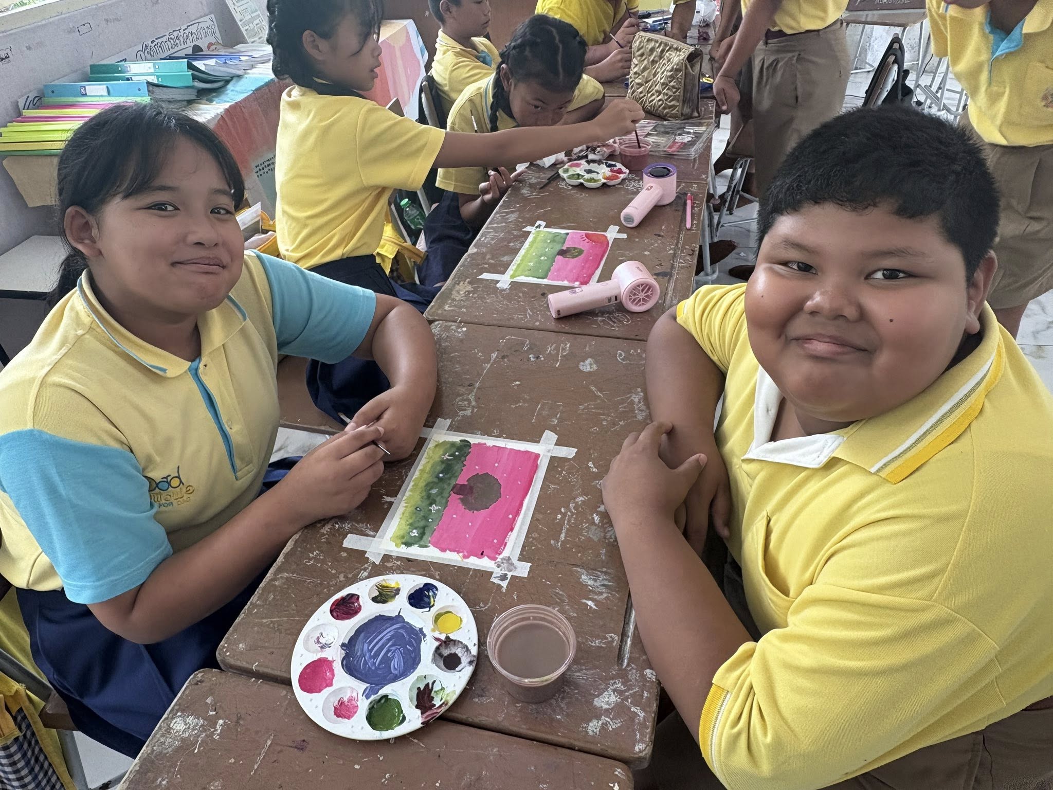 นักเรียนชั้นประถมศึกษาปีที่ 5 เรียนวิชาศิลปะ เรื่องการลงสีโปสเตอร์