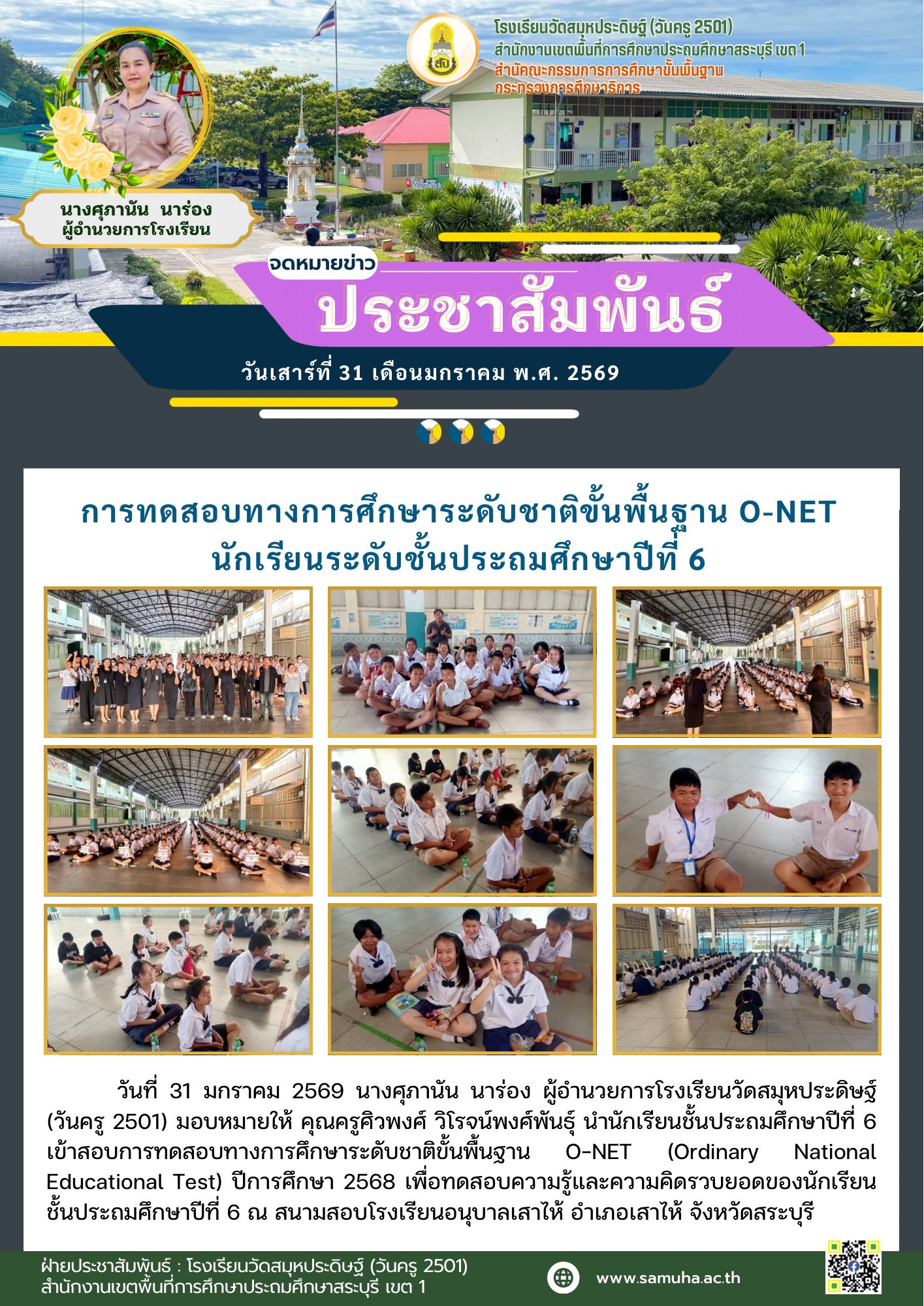 นางศุภานัน นาร่อง ผู้อำนวยการโรงเรียนวัดสมุหประดิษฐ์ (วันครู 2501) มอบหมายให้ คุณครูศิวพงศ์ วิโรจน์พงศ์พันธุ์ นำนักเรียนชั้นประถมศึกษาปีที่ 6 เข้าสอบการทดสอบทางการศึกษาระดับชาติขั้นพื้นฐาน O-NET (Ordinary National Educational Test) ปีการศึกษา 2568 เพื่อทดสอบความรู้และความคิดรวบยอดของนักเรียนชั้นประถมศึกษาปีที่ 6 ณ สนามสอบโรงเรียนอนุบาลเสาไห้ อำเภอเสาไห้ จังหวัดสระบุรี ![]()