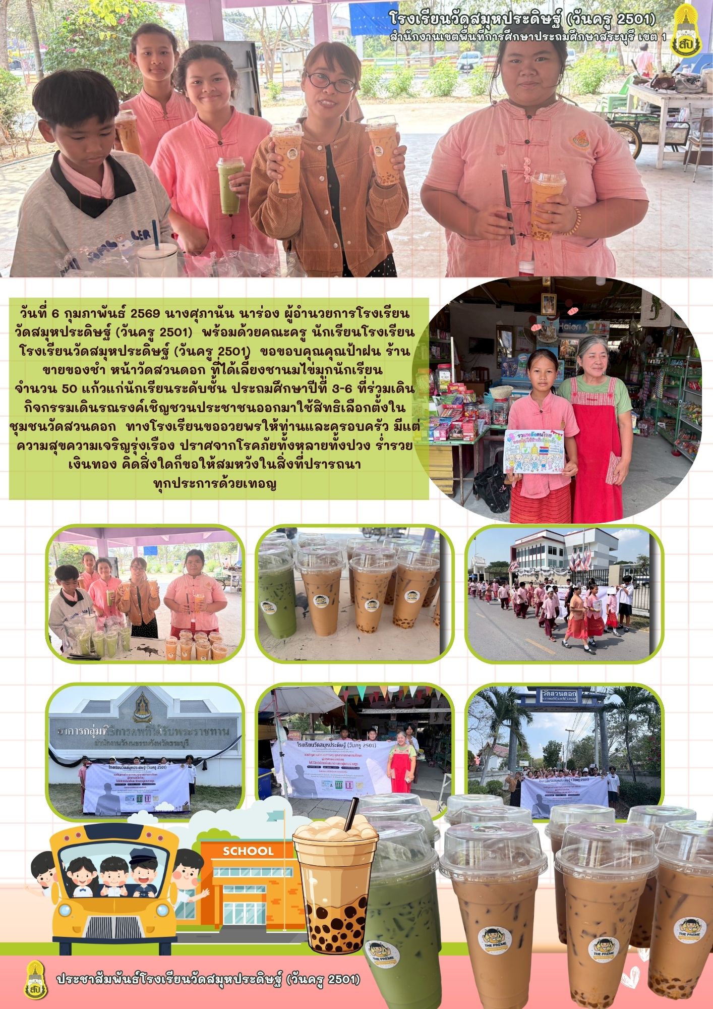 วันที่ 6 กุมภาพันธ์ 2569 นางศุภานัน นาร่อง ผู้อำนวยการโรงเรียนวัดสมุหประดิษฐ์ (วันครู 2501) พร้อมด้วยคณะครู นักเรียนโรงเรียนโรงเรียนวัดสมุหประดิษฐ์ (วันครู 2501) ขอขอบคุณคุณป้าฝน ร้านขายของชำ หน้าวัดสวนดอก ที่ได้เลี้ยงชานมไข่มุกนักเรียน จำนวน 50 แก้วแก่นักเรียนระดับชั้น ประถมศึกษาปีที่ 3-6 ที่ร่วมเดินกิจกรรมเดินรณรงค์เชิญชวนประชาชนออกมาใช้สิทธิเลือกตั้งในชุมชนวัดสวนดอก ทางโรงเรียนขออวยพรให้ท่านและครอบครัว มีแต่ความสุขความเจริญรุ่งเรือง ปราศจากโรคภัยทั้งหลายทั้งปวง ร่ำรวยเงินทอง คิดสิ่งใดก็ขอให้สมหวังในสิ่งที่ปรารถนาทุกประการด้วยเทอญ