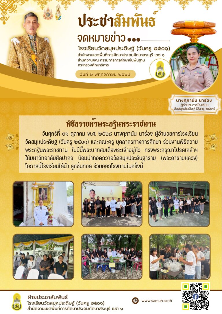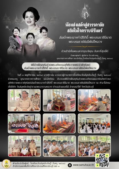 กิจกรรมของเรา ประกอบพิธีบำเพ็ญกุศลสวดพระอภิธรรมและเจริญจิตภาวนา อุทิศถวายพระราชกุศลแด่สมเด็จพระนางเจ้าสิริกิติ์ พระบรมราชินีนาถ พระบรมราชชนนีพันปีหลวง ณ ศาลาโสภณ-ปริยัติกิจ วัดสมุหประดิษฐาราม(พระอารามหลวง)3 พฤศจิกายน 20259 พฤศจิกายน 2025