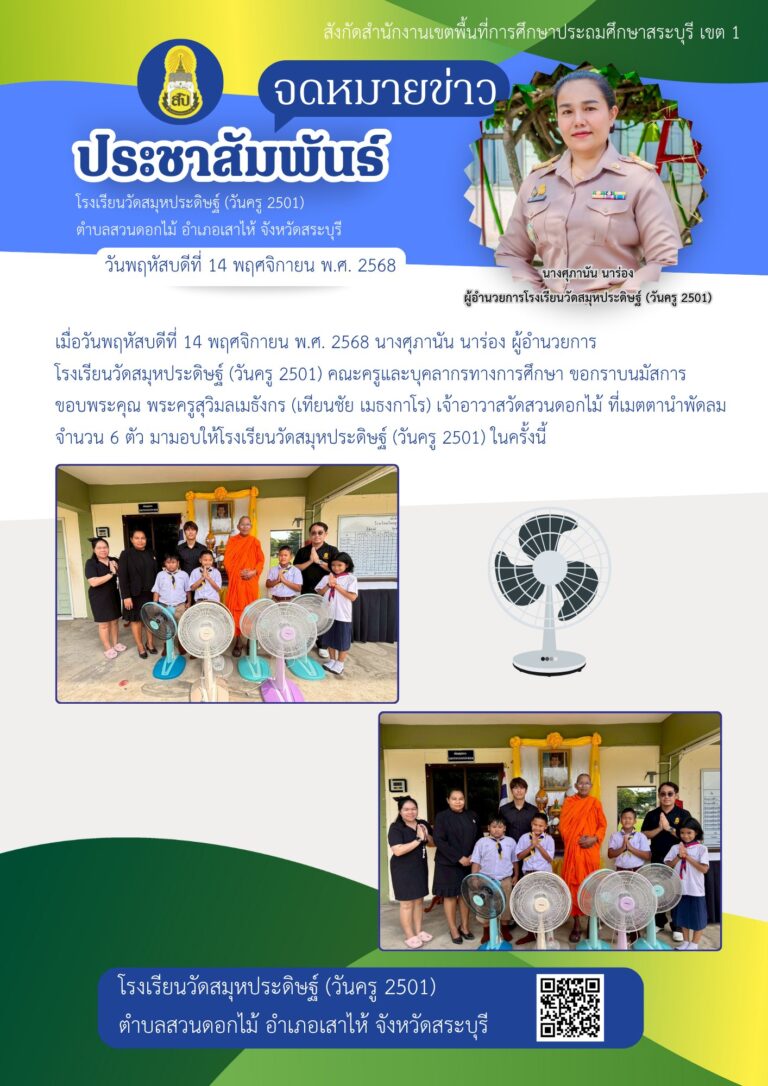 กิจกรรมของเรา กราบนมัสการขอบพระคุณ พระครูสุวิมลเมธังกร (เทียนชัย เมธงกาโร) เจ้าอาวาสวัดสวนดอกไม้ ที่เมตตานำพัดลม จำนวน 6 ตัว มามอบให้โรงเรียน14 พฤศจิกายน 202518 พฤศจิกายน 2025