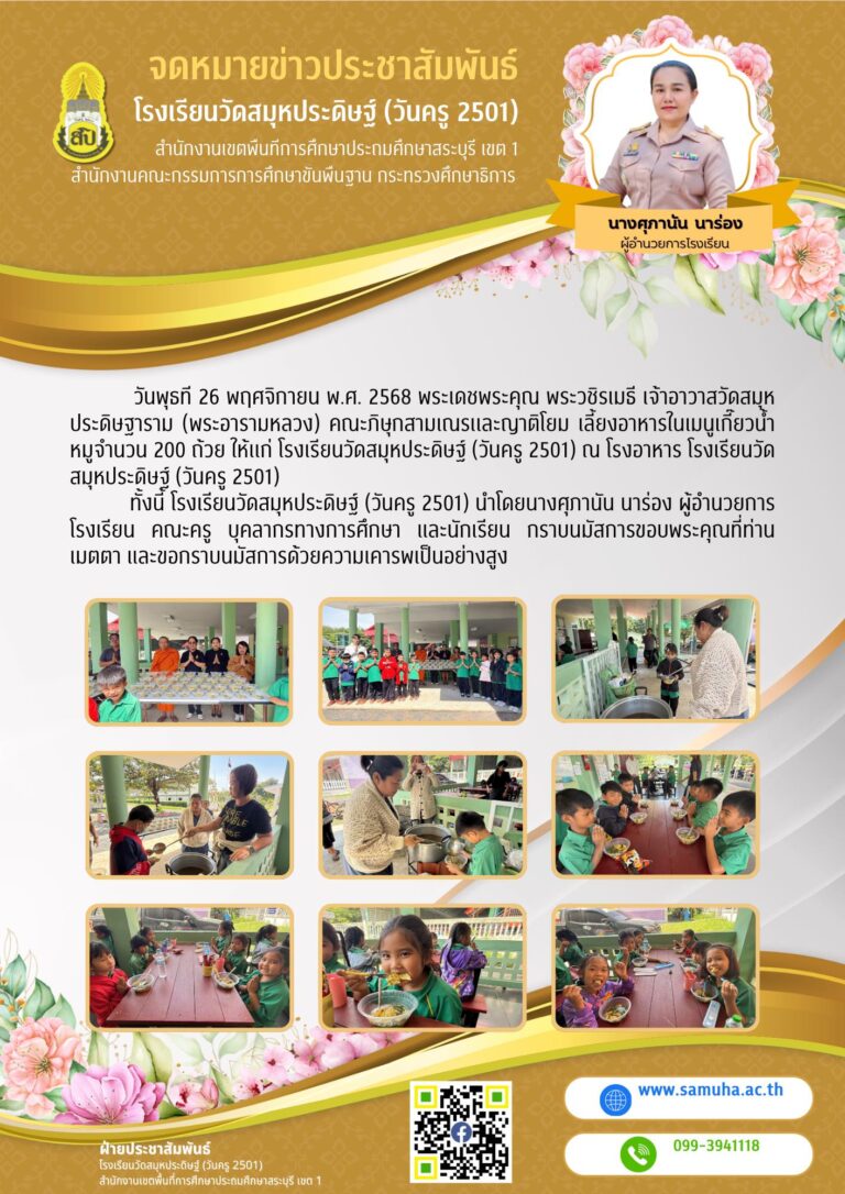 กิจกรรมของเรา เจ้าอาวาสวัดสมุหประดิษฐาราม (พระอารามหลวง) คณะภิษุกสามเณรเเละญาติโยม เลี้ยงอาหารในเมนูเกี๊ยวน้ำหมูจำนวน 200 ถ้วย26 พฤศจิกายน 20255 ธันวาคม 2025